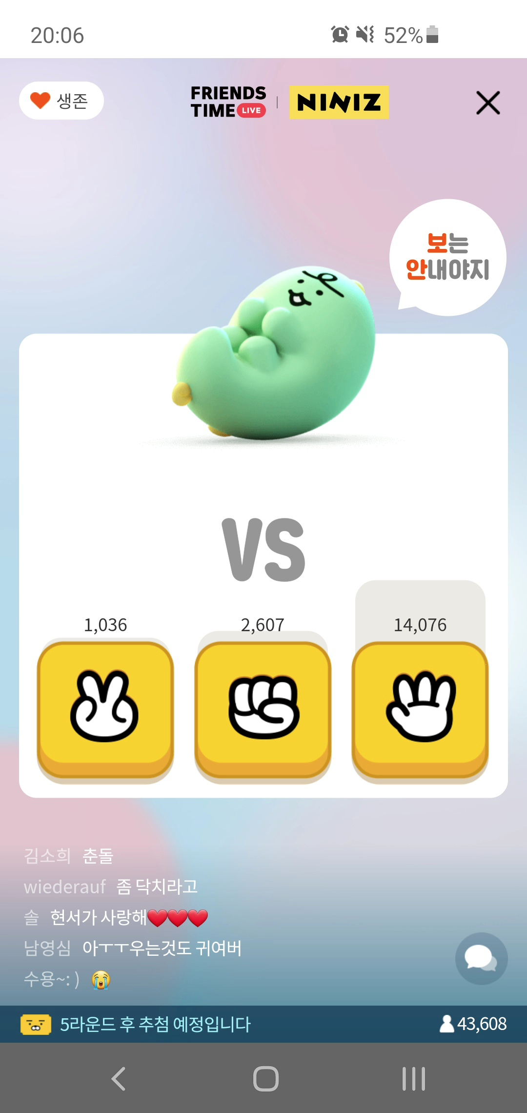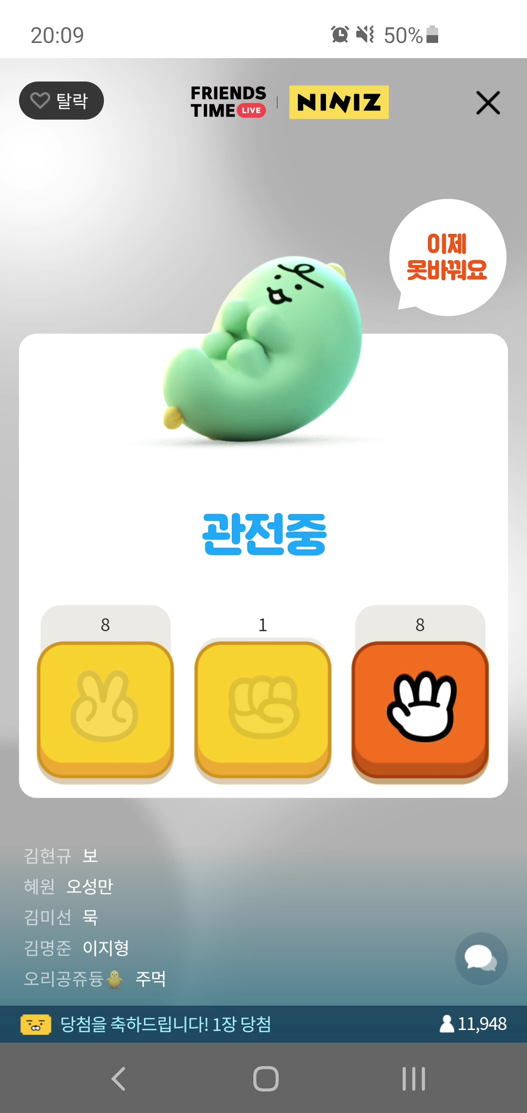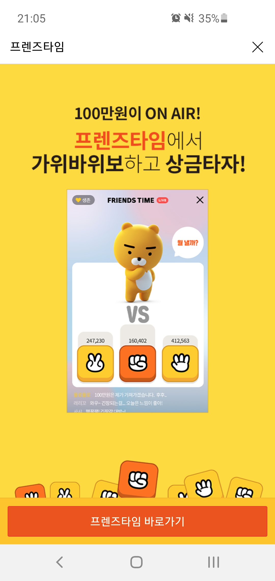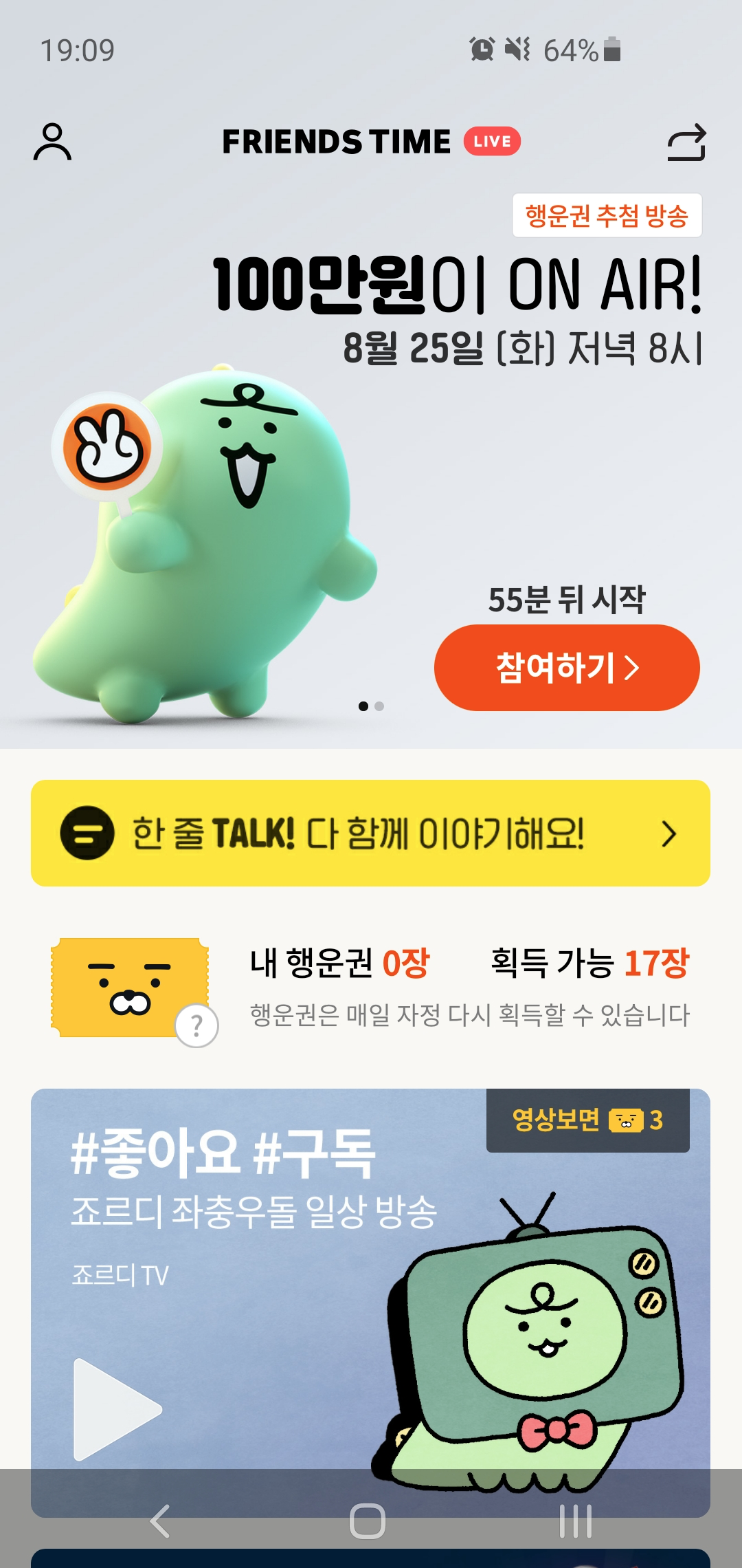 근데, 이번 '프렌즈타임' 라이브방송은 제가 좋아하는 캐릭터가 메인으로 출연, 가위바위보라는 매우 부담 없는 게임, 저녁 8시 진행이라는 부담 없는 조건들로 서비스를 경험해보기로 결심했습니다.