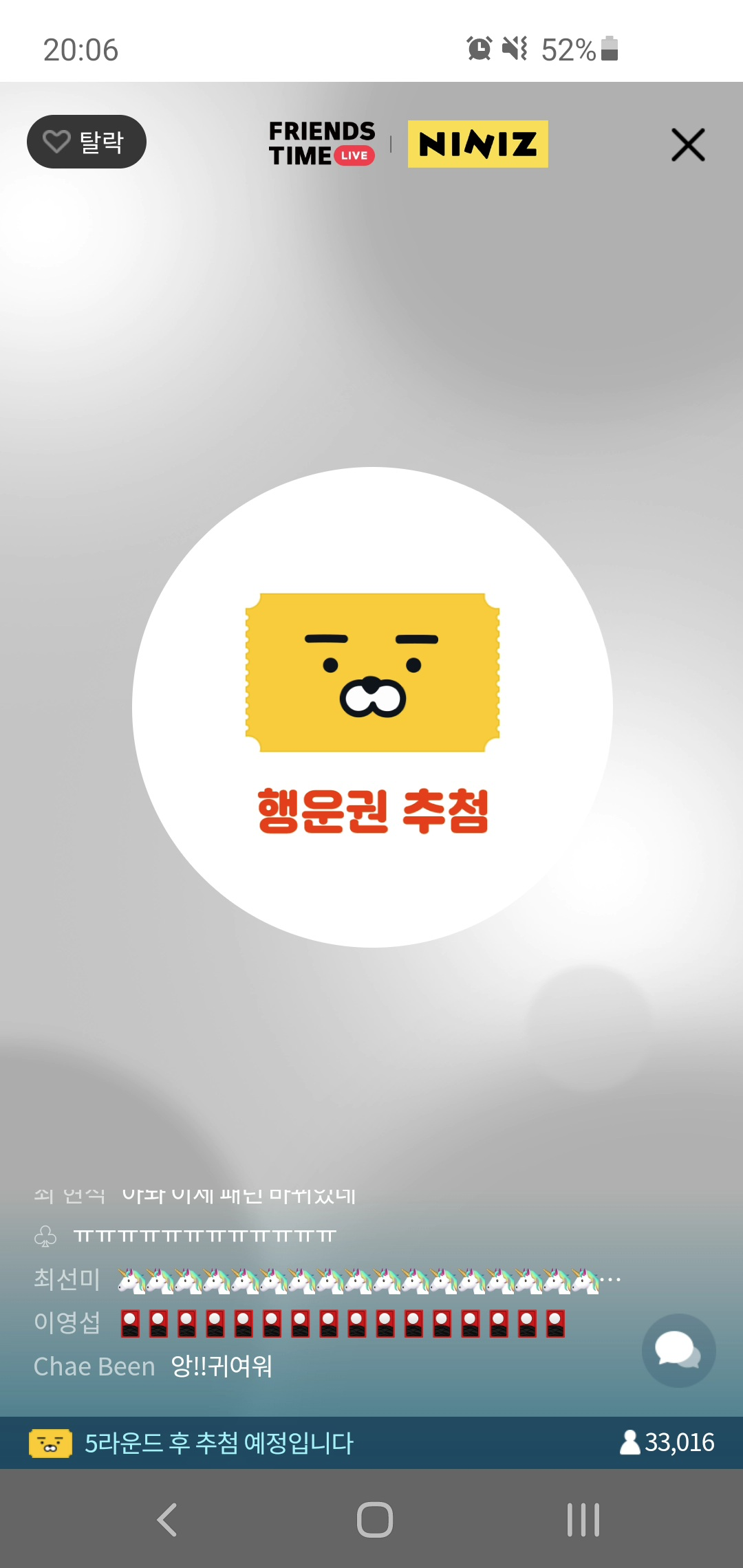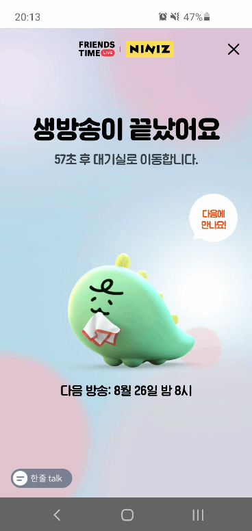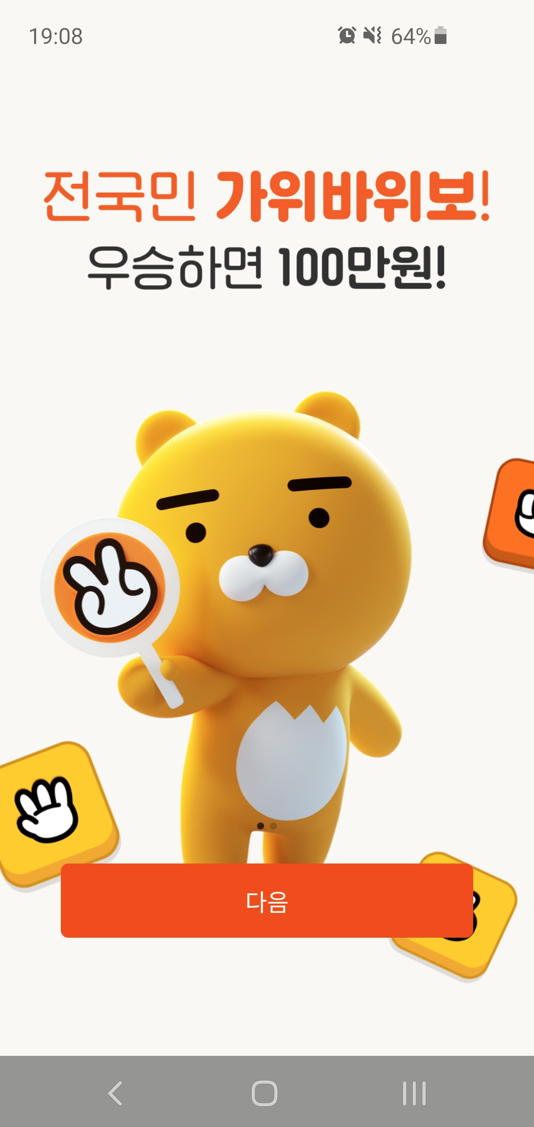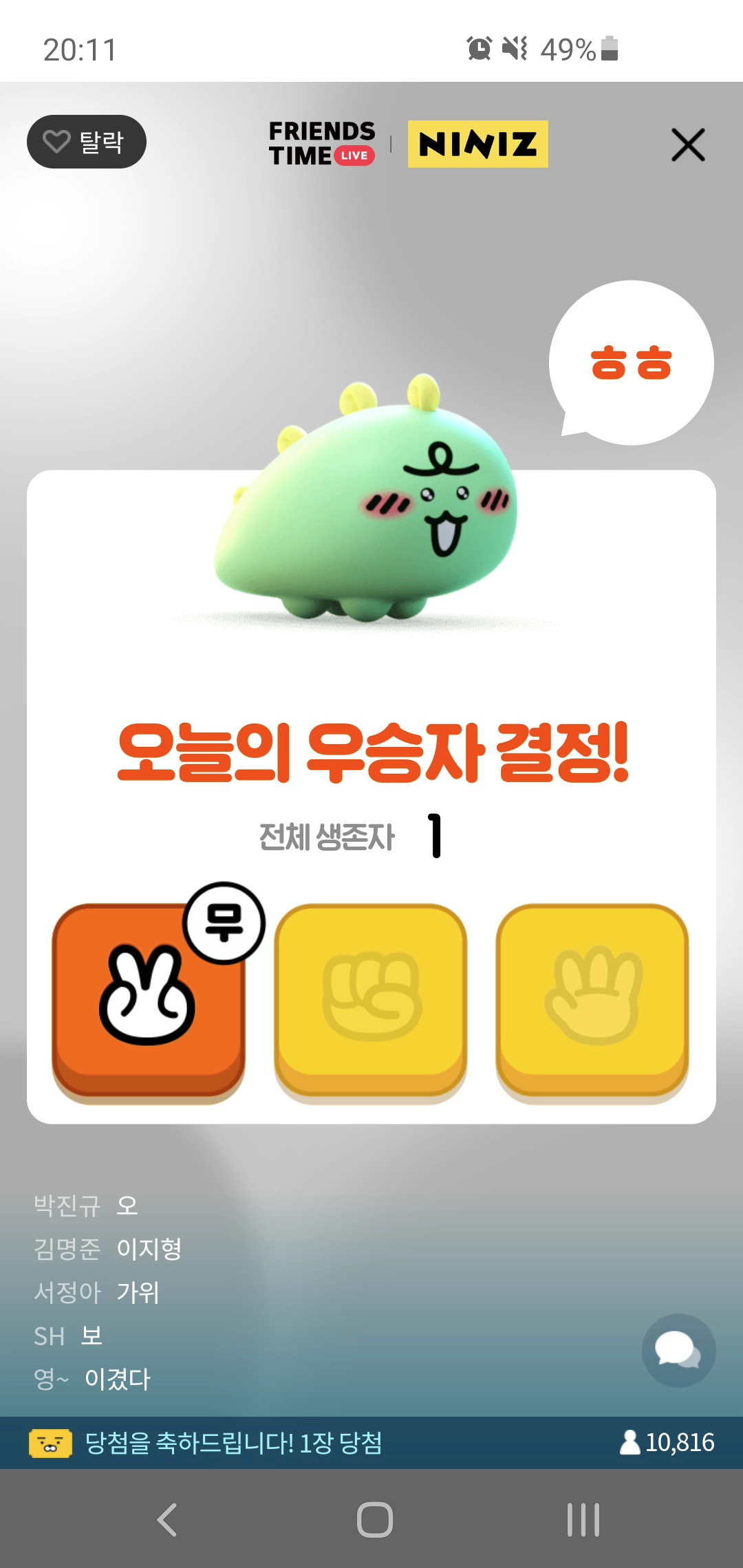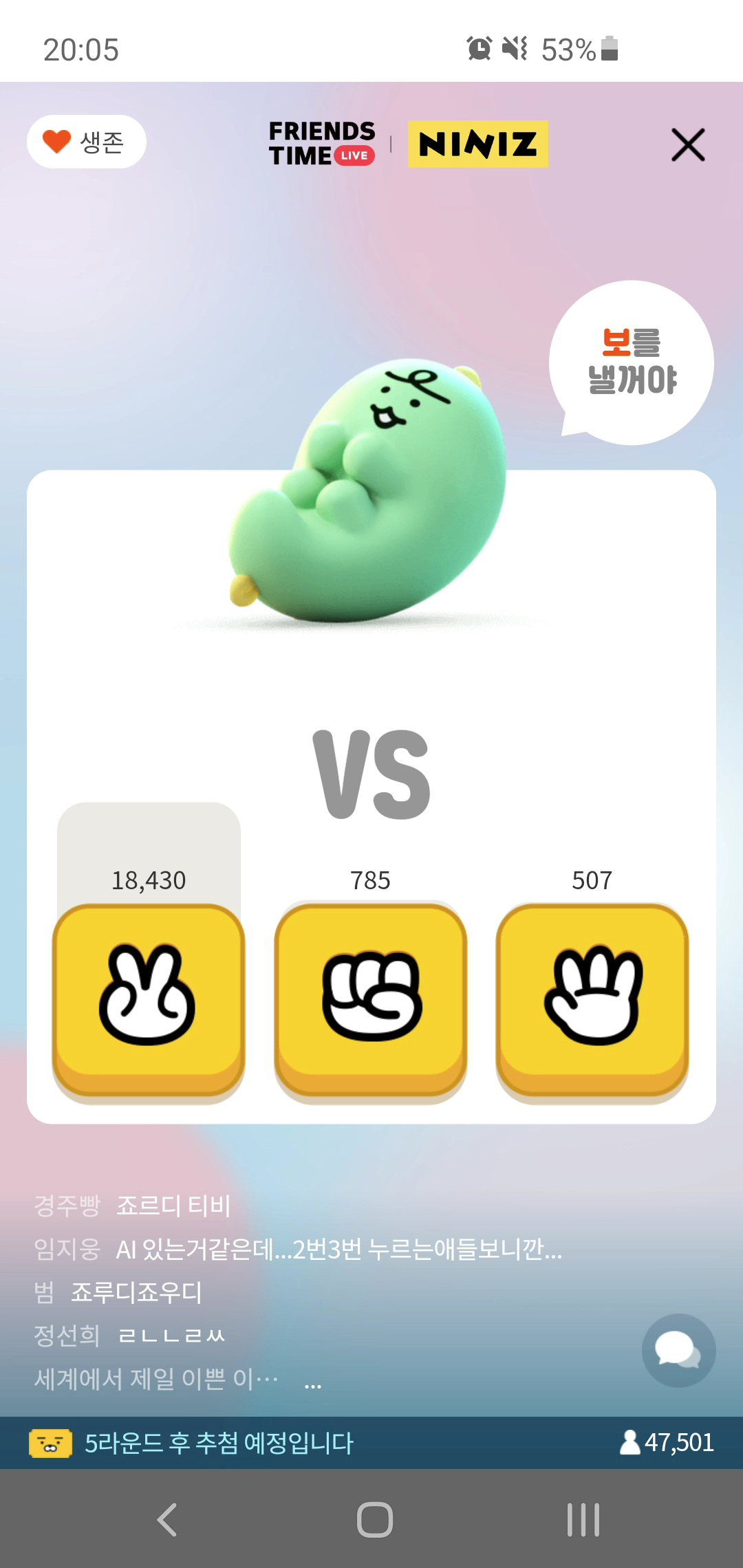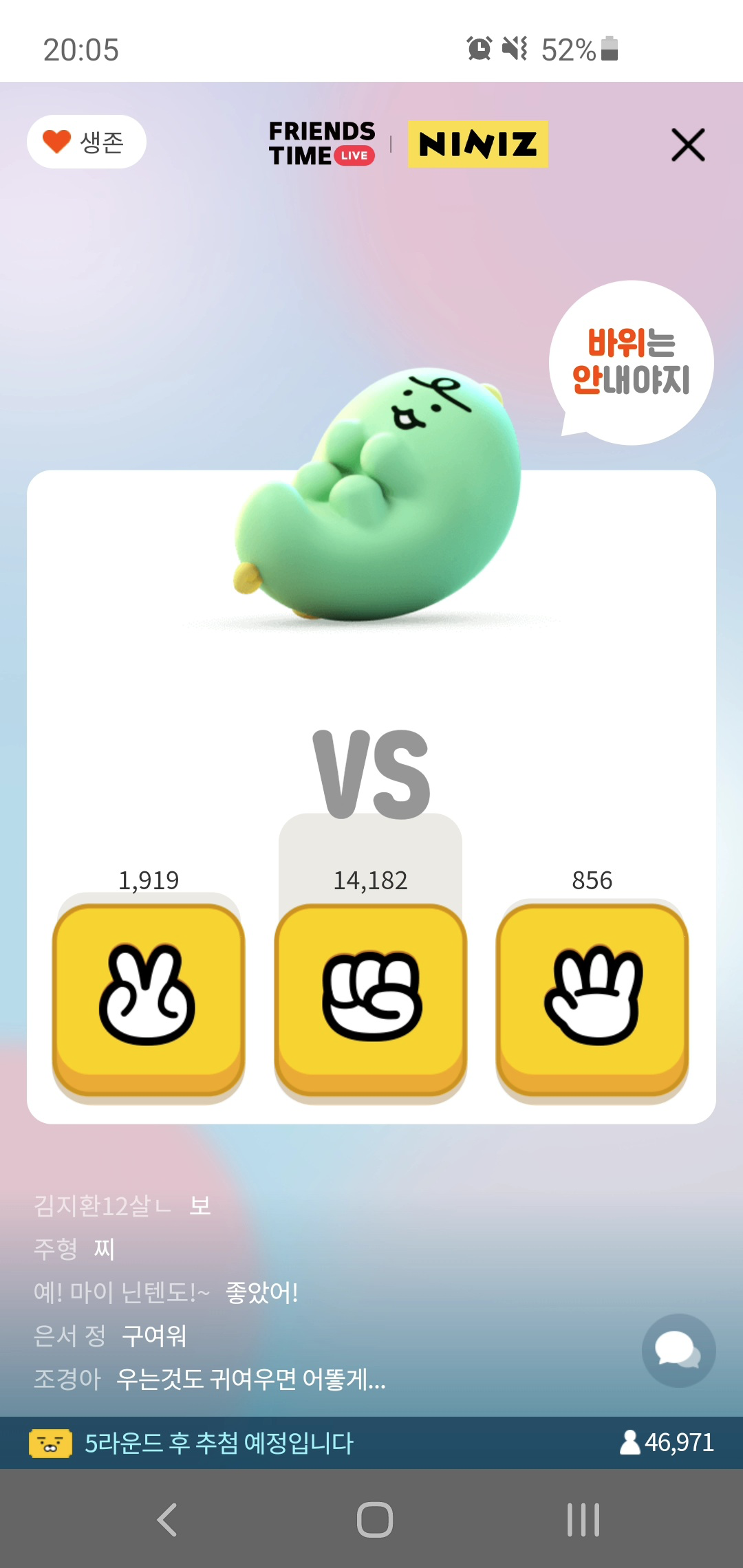 근데, 이번 '프렌즈타임' 라이브방송은 제가 좋아하는 캐릭터가 메인으로 출연, 가위바위보라는 매우 부담 없는 게임, 저녁 8시 진행이라는 부담 없는 조건들로 서비스를 경험해보기로 결심했습니다.