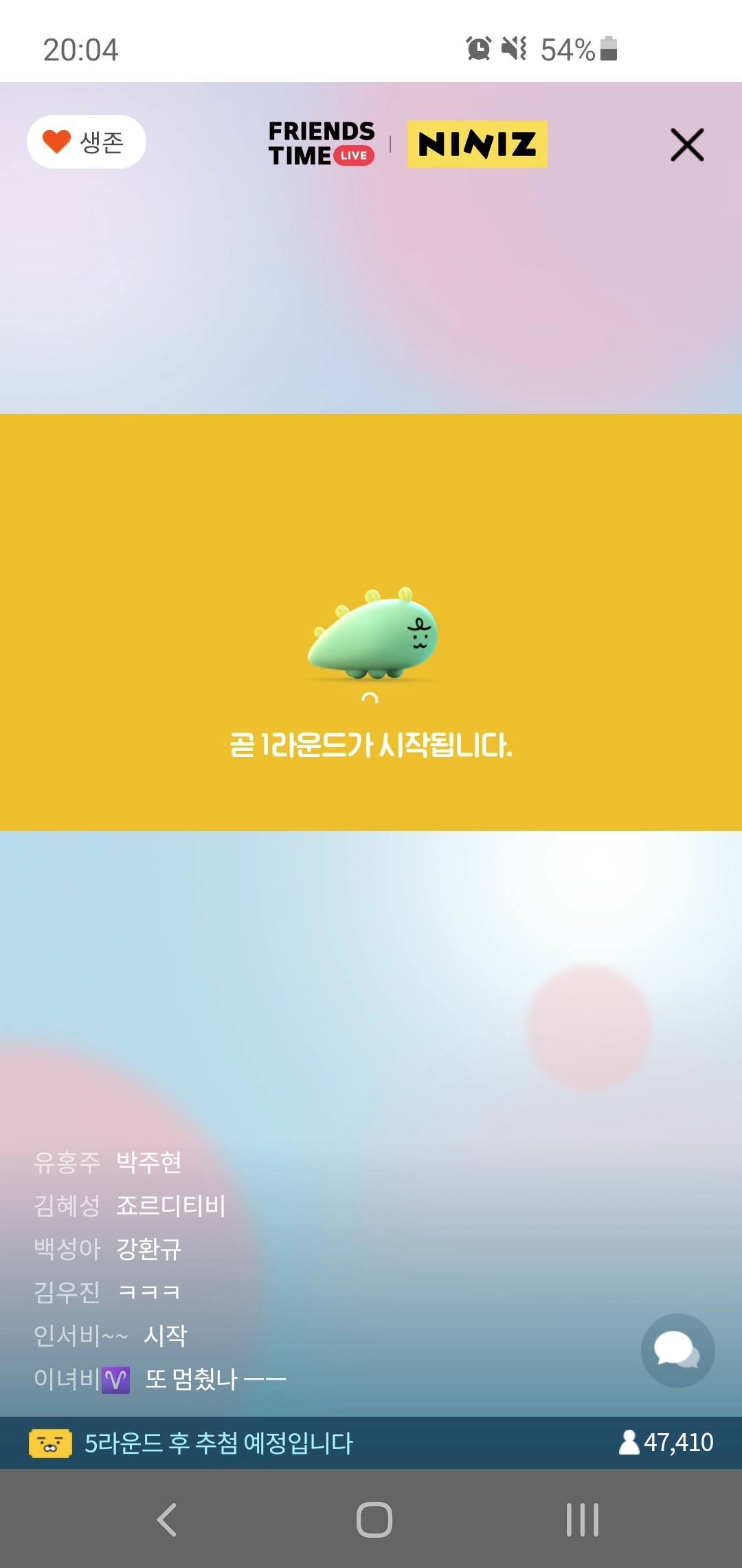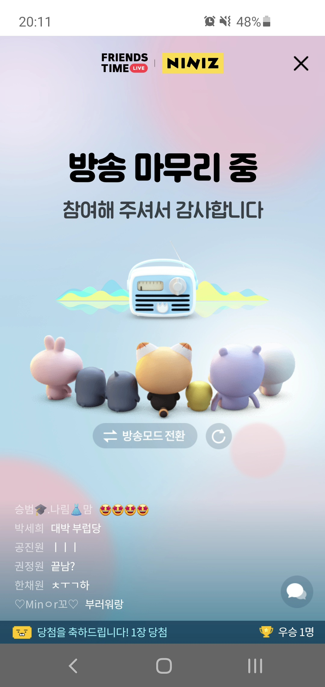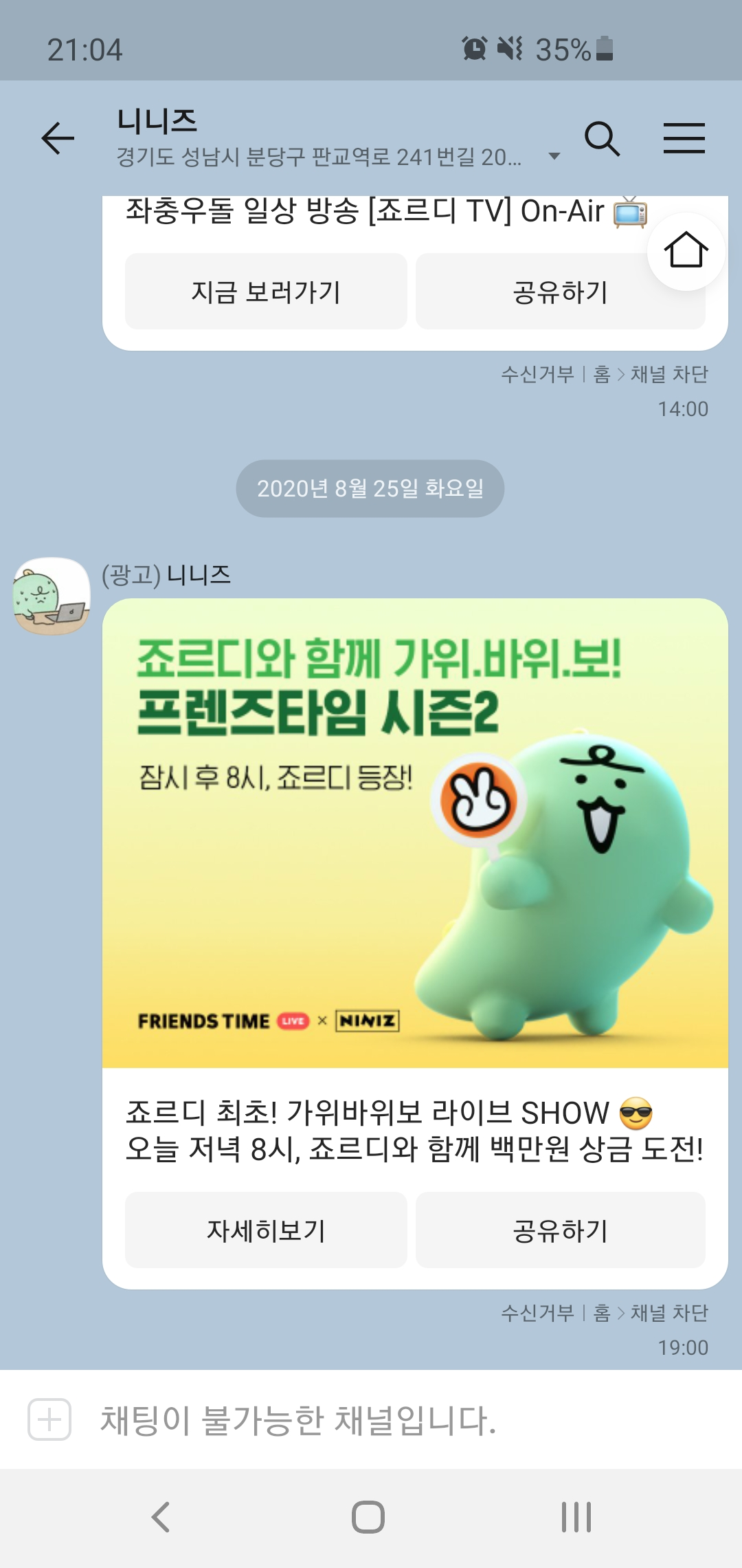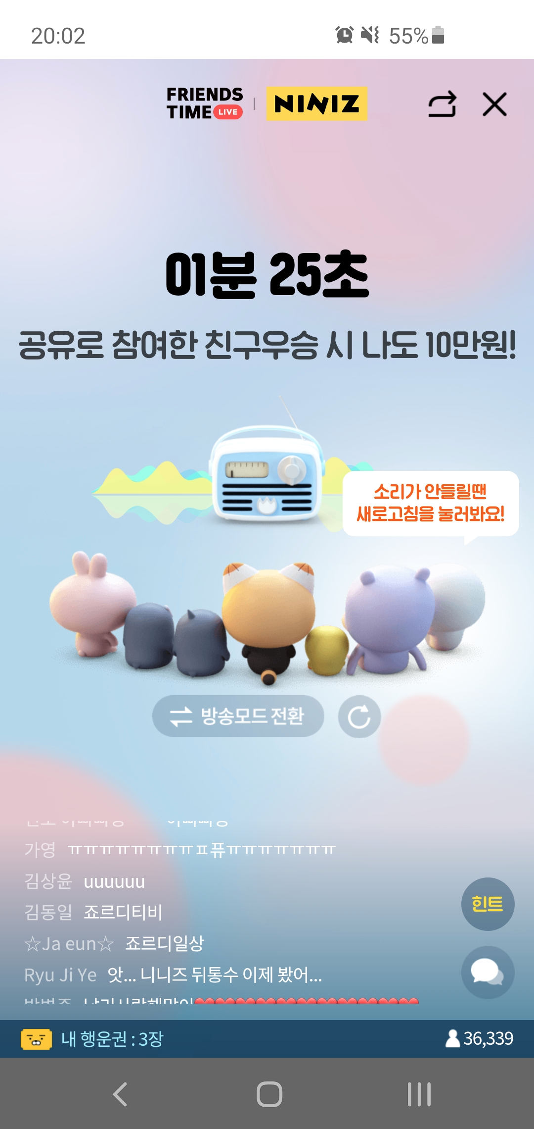근데, 이번 '프렌즈타임' 라이브방송은 제가 좋아하는 캐릭터가 메인으로 출연, 가위바위보라는 매우 부담 없는 게임, 저녁 8시 진행이라는 부담 없는 조건들로 서비스를 경험해보기로 결심했습니다.