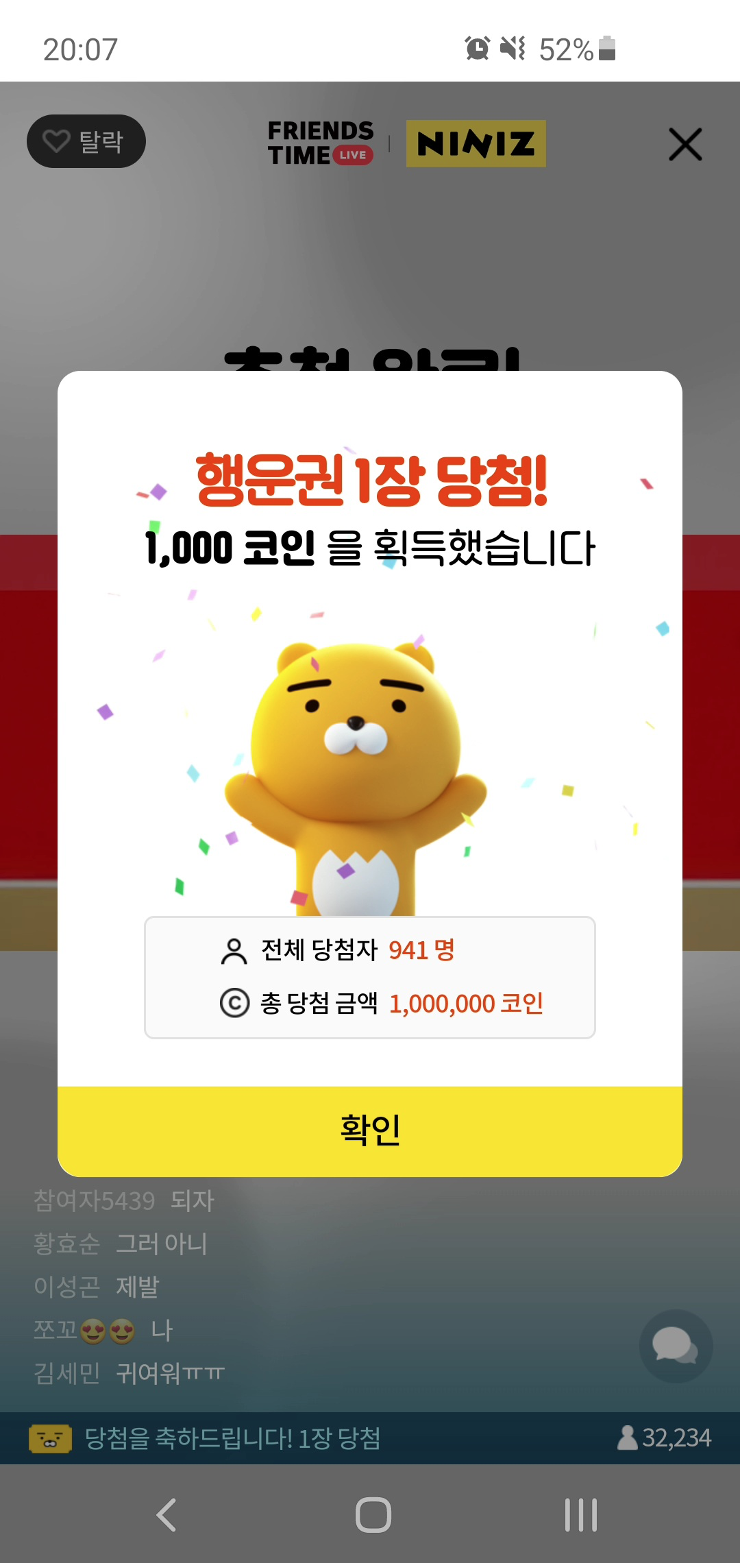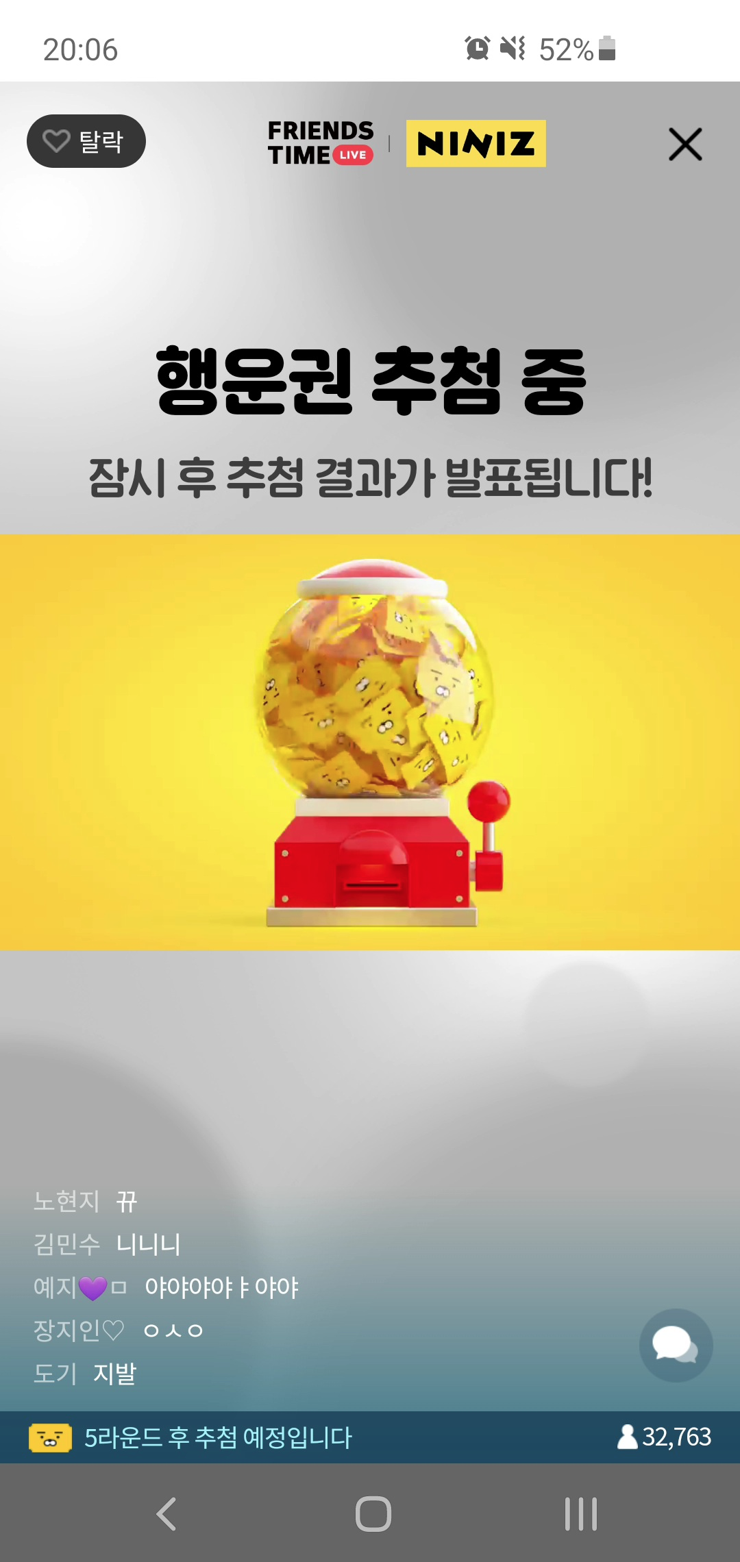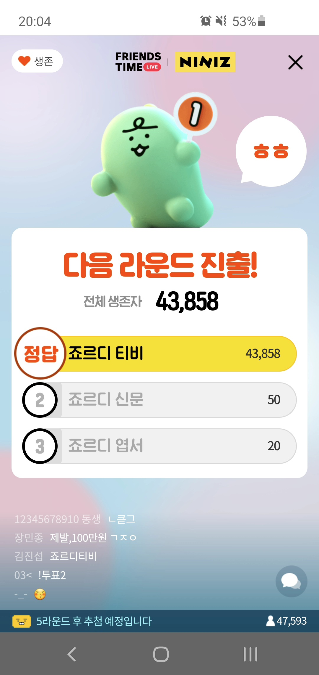 5번째 라운드에서는 위에서 언급했던 행운권 추첨이 진행됩니다. 라이브 방송에 참여 중인 1000명을 추첨하여 현금으로 바로 전환할 수 있는 1,000 코인을 지급합니다. 저는 운 좋게 한 장 들고 있다가 당첨되어 1,000 코인을 받을 수 있었네요. 행운권만 가지고 있다면, 자동으로 추첨에 참여하기 때문에 매우 간단하게 참여할 수 있습니다. 방송 참여 당시 참여자가 평균 4만 명 정도 되었으니 약 4:1의 경쟁률을 가지고 있었습니다.