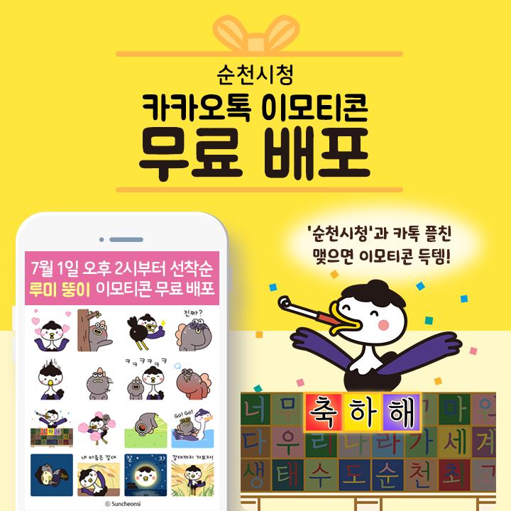 7월 1일(수) 오후 2시 / 카카오톡 <순천시청>채널 친구 추가를 통해 이모티콘 16종을 배포한다고 합니다.